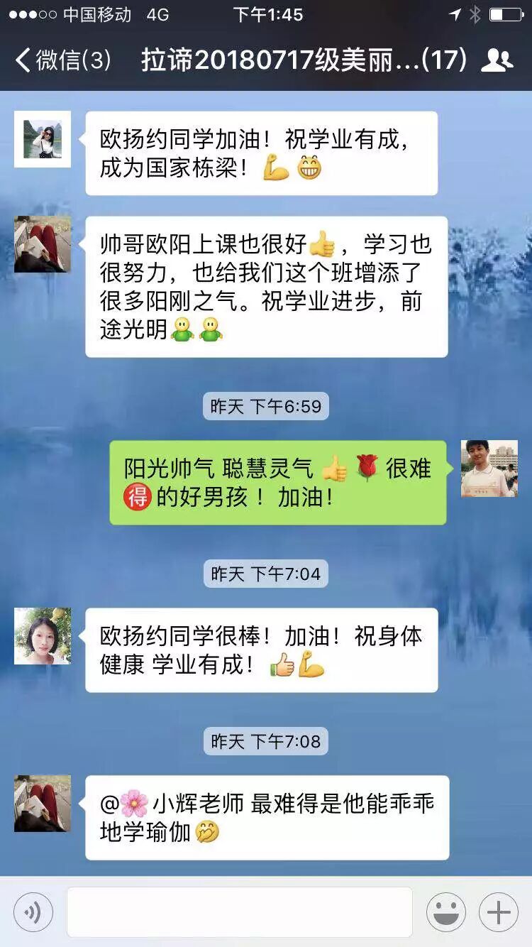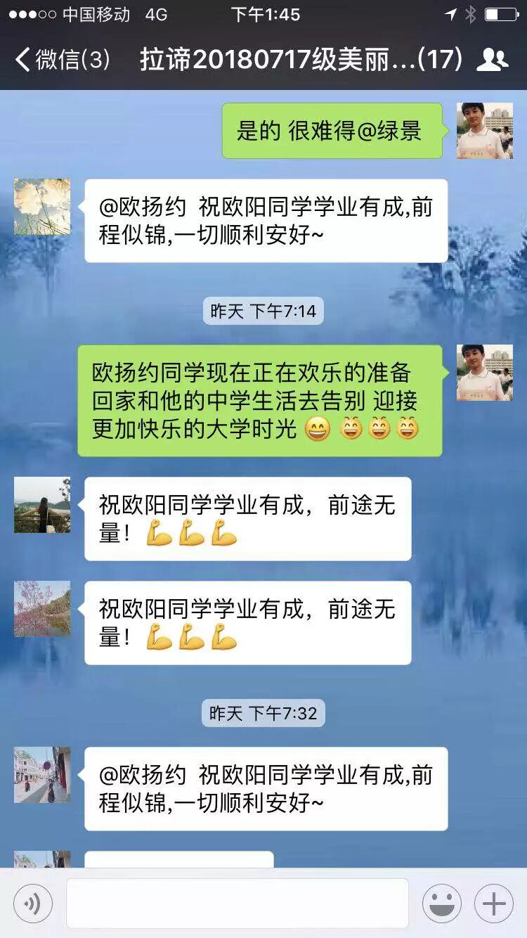 儿子第一次去拉谛,回来后说老师们和同学们无比的好,他的开心与喜悦由心而发,我内心也是喜滋滋的;第二次去拉谛,回来后说老师很严格,又很善良,又很温柔,又很美,像妈妈一样的关心他,同学们也非常的友善,我心怀感恩,感恩拉谛每一位老师的付出,同时也认为磁场也非常的重要,不知庞老师有没有同感?
